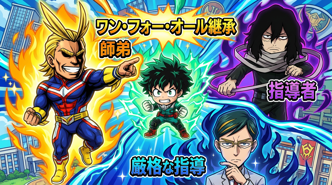 | 緑谷 出久(デク) | オールマイト | 師匠/師弟。デクに「個性」ワン・フォー・オール(OFA)を継承し、ヒーローとしての全てを教え込んだ文字通りの「光」。 |