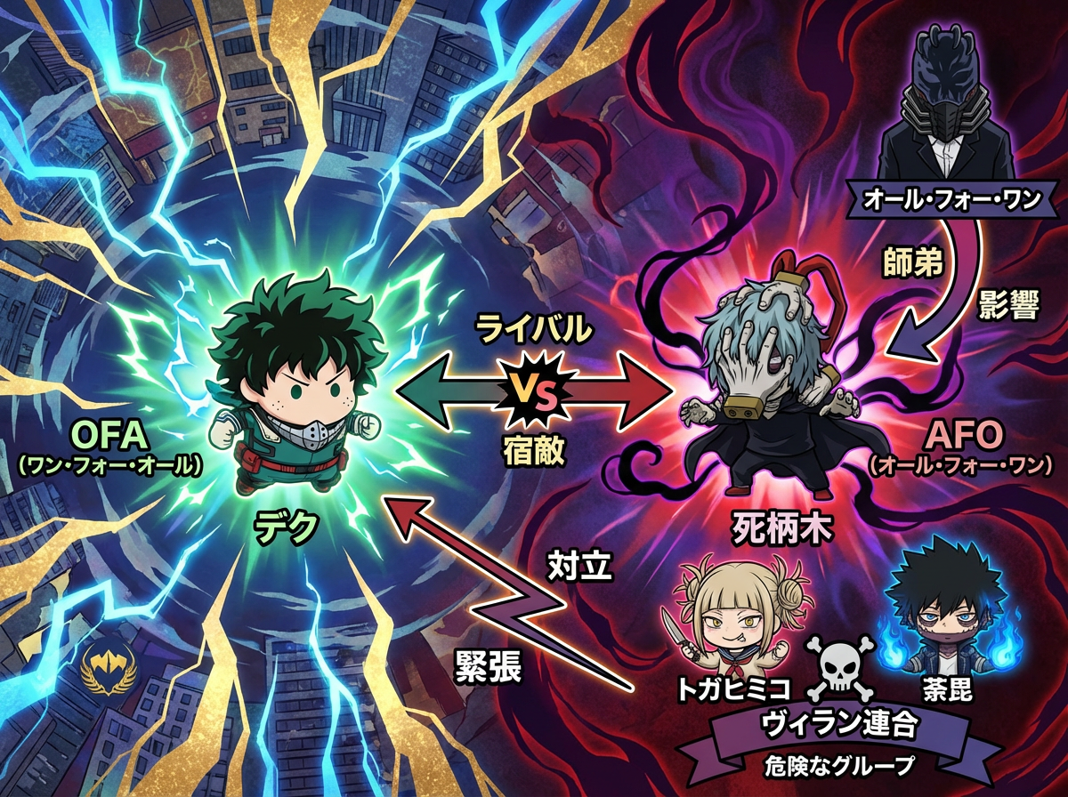 | 緑谷 出久(デク) | 死柄木 弔 | 宿敵/運命のライバル。それぞれOFAとオール・フォー・ワン(AFO)という力を継承した、正反対の道を歩む者同士。 |